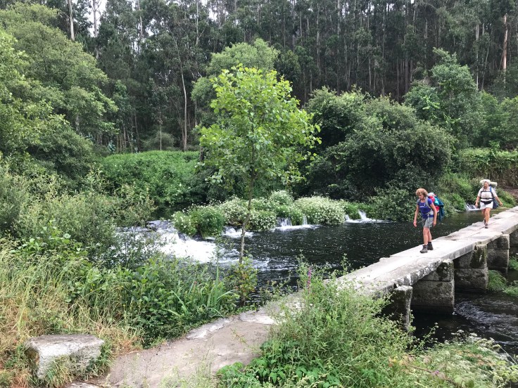 We starten met een broodje ham en kaas en koffie ontbijt in een cafeetje vlakbij onze herberg. We lopen al gauw een bos in met rotsige paadjes, soms klauteren, watervalletjes en dan een lange oude brug.