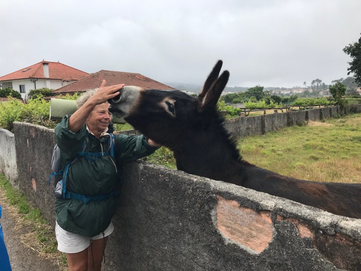 We gaan weer door bewoond gebied en op afstand horen we een ezel naar ons ‘ia’ roepen. Marga heeft een groot hart voor dieren en al gauw begint ze de kop van de ezel te pakken en hem te aaien.
