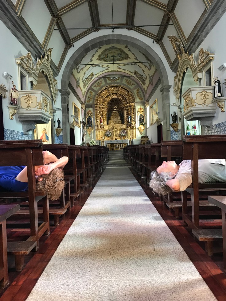 We bezoeken een imposante kerk met veel schilderingen op de muren en op het plafond. Nicolien en Marga zijn erg moe en gaan op de kerkbank liggen.