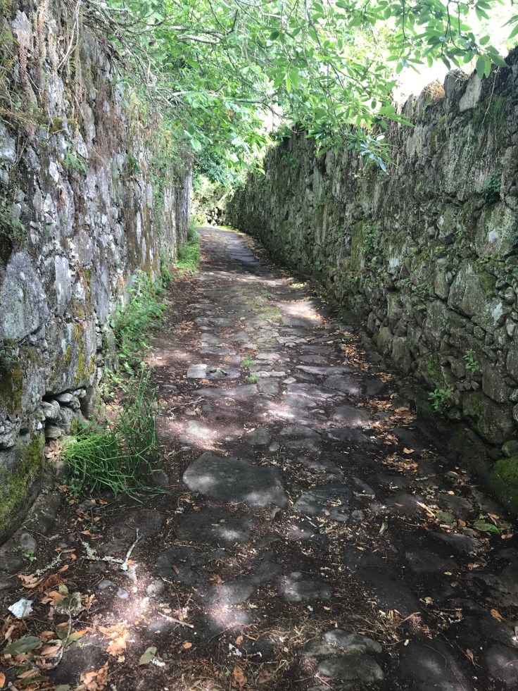 De laatste kilometers lopen we tussen oude muren van graniet, begroeid met mos en klimop over een oud (Romeins?) kronkelpad langs oude woningen waartussen moestuinen en wilde kruiden groeien.