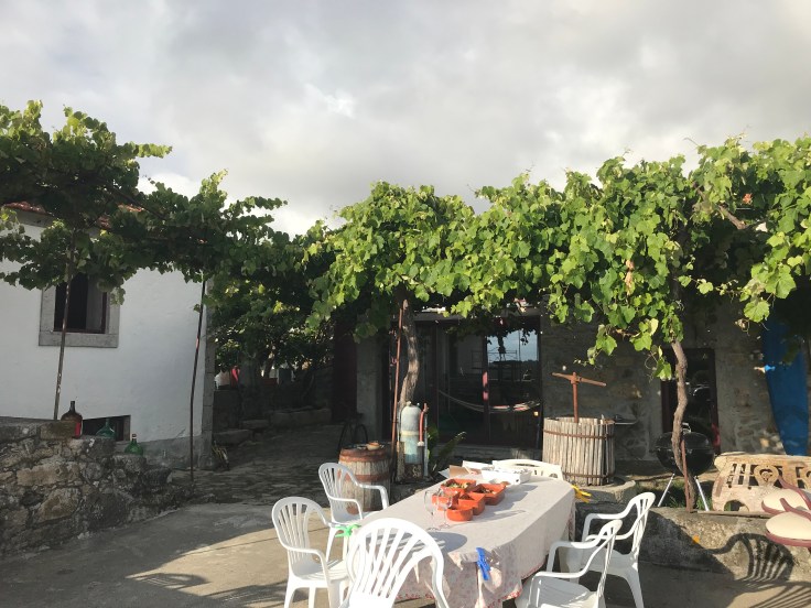 Langzaam worden de huizen moderner en wordt de weg van asfalt. De muren zijn schoon zonder begroeiing en onderbroken door een grote ijzeren bruine of groene poort. Wat er achter die muren is en op dit moment gebeurt, weet je niet. Soms staan er luxe auto’s geparkeerd, er zijn nauwelijks mensen op straat. Op een gegeven moment dalen we af en slaan bij een bar/kruideniertje rechts af. We kopen wat avondeten en stijgen op naar een weggetje dat uiteindelijk uitkomt bij de poort van ons logeeradres van vanavond: Albergue Casa do Sardao.