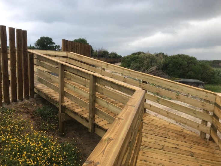 Al gauw lopen we weer op het km’s lange houten plankenbruggetje langs het strand met ruige zee onder bewolkte lucht (maar droog).