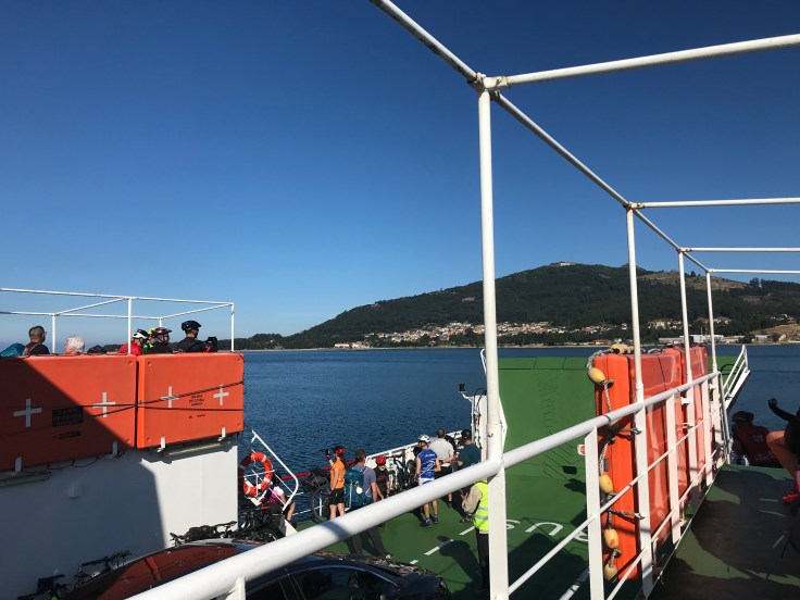 Buiten verbetert onze stemming: het is mooi en een beetje fris weer, heerlijk om te wandelen. We ontbijten om de hoek en lopen naar de ferry die ons naar Spanje gaat brengen. De eerste oversteek van vandaag is pas om 9 uur, nogal laat eigenlijk. Als er ook nog eens het tijdverschil met Spanje bijkomt (een uur later) bijkomt, dan zijn we netto erg laat vertrokken. Om half 11 zijn we dus in Spanje, Galicië.