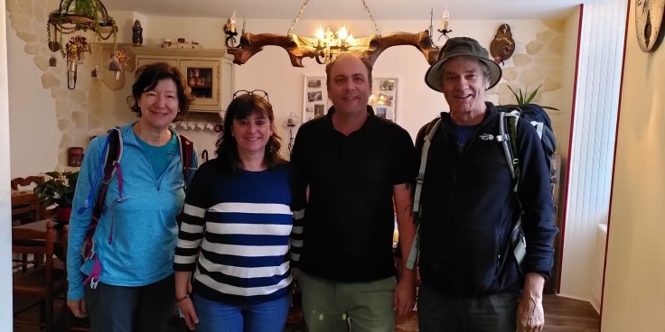 De eigenaar Sébastien is charcutier, fijnslager die een kunstenaar is in het maken van paté’s, worsten, en nog veel meer. We eten ‘s avonds daar met nog een gast, Catherine, een Franse dame die als docent Franse letterkunde werkt aan de Universiteit in Cardiff (Wales). Heerlijke maaltijd waarbij Sébastien alles uitlegt over elk ingrediënt en culinair hoogstandje: hoe het gemaakt is, waar het vandaan komt (lokaal) en de Franse naam. Hij en zijn vrouw Sylvie spreken vrijwel geen Engels, dus ik vertaal hier en daar voor Dorien die ook met Catherine Engels kan praten. Behalve het heerlijke eten, wordt het erg gezellig wanneer Sébastien en ik elkaar begrijpen op het gebied van liedjes van vroeger van: Johnny Hallyday (‘Pour moi la vie va commencer…’), Jacques Brel, etc. , films en boeken uit vroegere jaren. Soms zelfs samen gezongen. Bijzondere avond, veel gegeten en ook wel veel wijn gedronken. Toch nog een geslaagde dag geworden. Morgen vroeg op naar de bus om drie dagtochten verder weer te gaan wandelen.