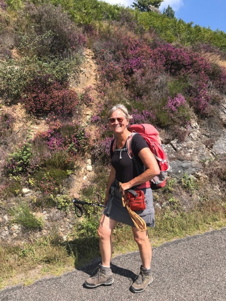 Het is warm, veel wolkjes, maar ook ‘s middags moeten we nog doorlopen. Dan zien we vanaf hoogte de stad Conques liggen. In het dal, zo schatten we.