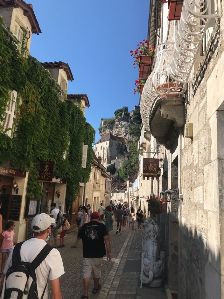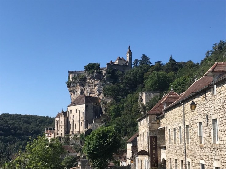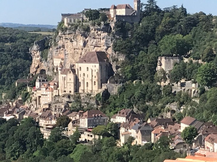 Het aanliggend dorpje heet L’Hospitalet waar het een enorme drukte van langzaam rijdende auto’s is. Veel lopende toeristen die linksom of rechtsom de weg kiezen naar de grotwoningen en -kerken van Rocamadour. Wij gaan links en dat blijkt een goeie keuze. We dalen langzaam af en zien vanaf de eerste 100 meter al de bekende rotswand verschijnen met de kerktorens en -daken. We blijven foto’s maken want het is toch wel bijzonder.