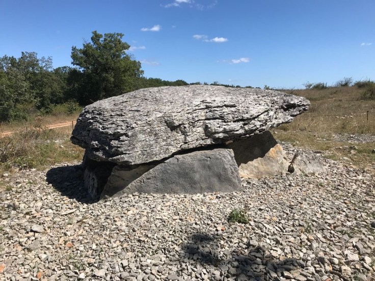 Ongeveer halverwege komen we op een bijna sacraal plekje waar een restant van een hunebed (een dolmen) ligt tegenover het oudste stenen kruis dat we langs de pelgrimsweg vinden.