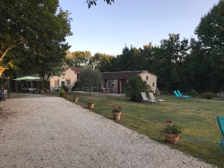 We genieten van een uitgebreid Frans ontbijt. Ik krijg een sandwich mee voor de lunch, Dorien krijgt yoghurt en een paar eitjes mee. Tenslotte ook wat fruit. We nemen afscheid van Josette en Claude en hun mooie gîte.