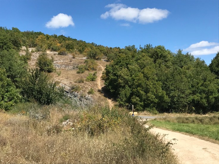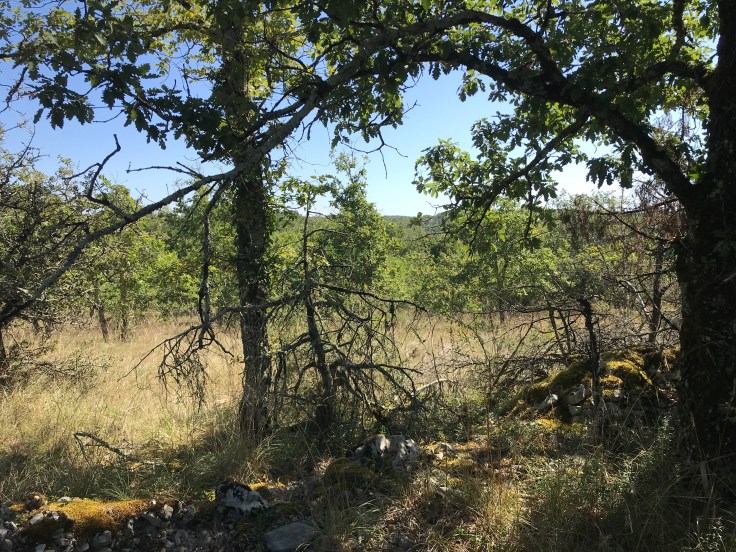 Het is een mooi wandelgebied hier in de Causse, waar oppervlaktewater schaars is en de aanleg van paadjes heeft geleid tot stenenverzamelingen waarmee bijvoorbeeld bankjes worden gemaakt in het bos. Veel muurtjes, rode grond met veel stenen erin.