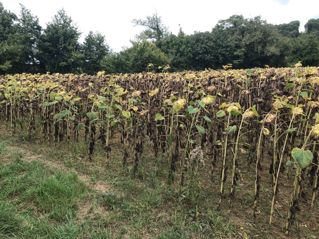 Na een lunch in het bos, trekken we verder. Steeds meer velden met zonnebloemen die hun kopjes laten hangen bij dit weer.