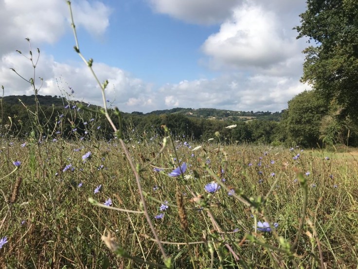Het is mooi weer. Lange tijd ‘achtervolg’ ik een rode rugzakdrager. Die blijkt later een Franse vrouw (65+) te zijn uit Couvin, bij de Belgische grens. Het rugzakje is licht, ze slaapt elke nacht in de camper die haar man dagelijks achter haar aan rijdt. ‘Mijn man houdt niet van wandelen.’