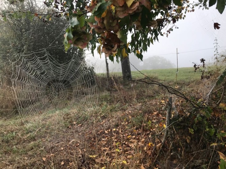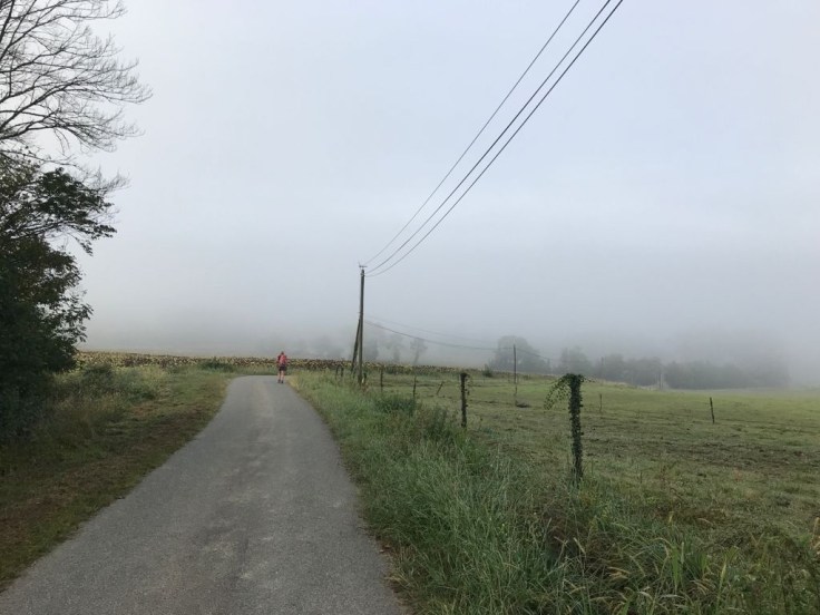 Het belooft een mooie dag te worden. Maar we zitten al in het voorgebergte van de Pyreneeën, waar in deze tijd van het jaar nevelslierten kunnen hangen in de dalen. En die blijken er ook te zijn wanneer we vertrekken. Die natte mist is koud en trekt in je kleren. Ik besluit vanmorgen mijn fleece aan te trekken, zolang de zon nog niet te zien is.