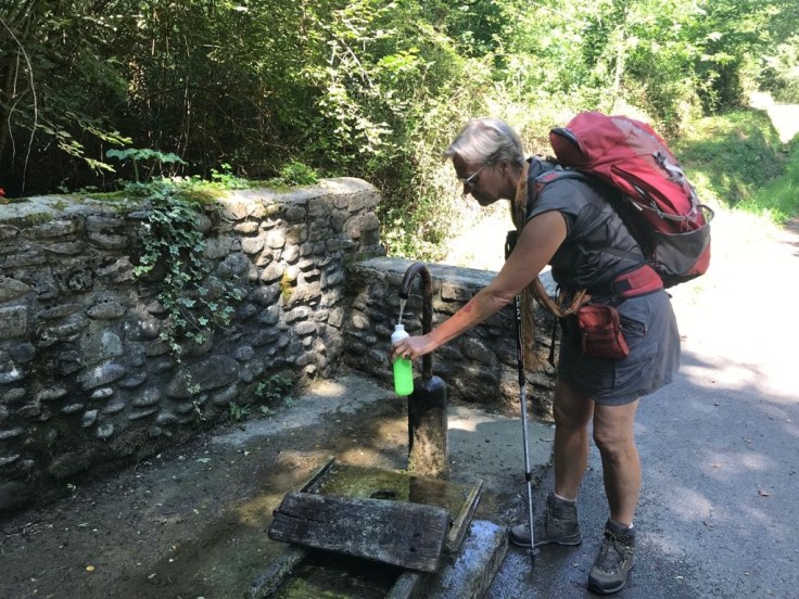 Na een lange tocht tussen de boomloze akkers, komen we na een lange afdaling terecht bij een natuurlijke bron, heerlijk koel fris drinkwater.