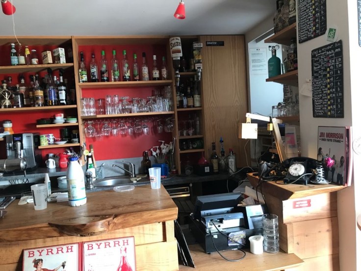 Op het terrasje waar we gaan zitten, zijn de resten van de vorige dag nog aanwezig: een propvolle asbak, biervlekken op tafel en kratten bier in de hoek. Maar gezellig is het zeker ook. Met de kastelein en een jonge Georges Moustaki.