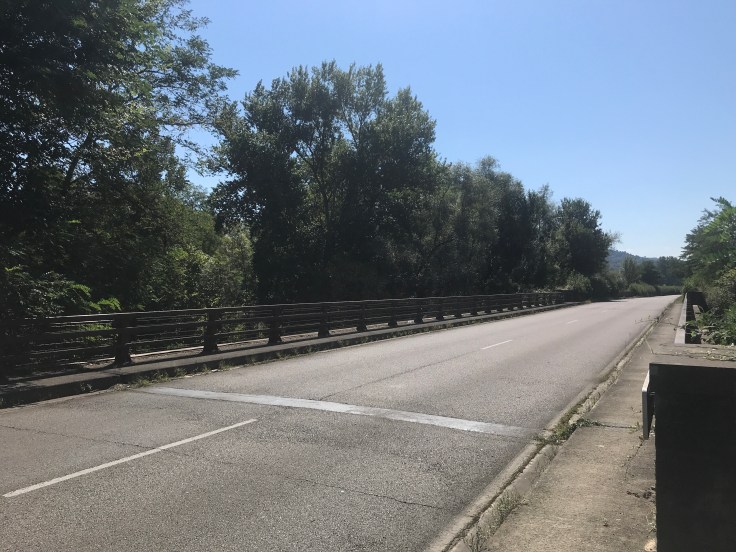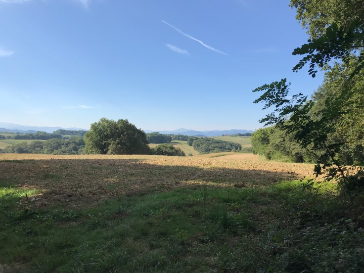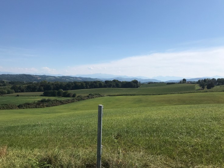 We lopen over asfalt door een zacht golvend landschap van landbouwvelden en weilanden waar weinig bomen zijn. Het is zo heet (35+graden) dat we van boom naar boom lopen en even rusten om schaduw te vangen. In de verte zien we de Pyreneeën liggen.