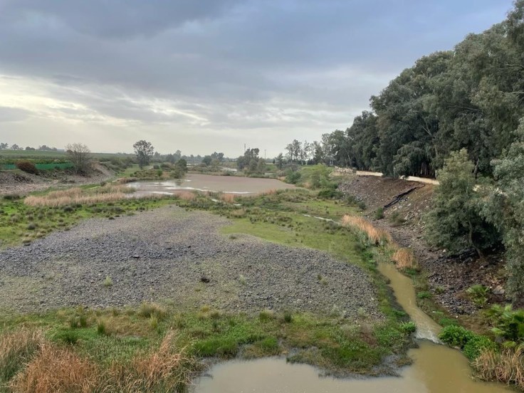 Het regent licht als ik door het dorp naar de brug over de brede rivier met lege bedding loop.