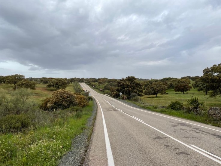 De eerste 16 km gaan over het asfalt: een autoweg waar door auto’s, fietsers en motoren keihard wordt gereden. Een weg met veel bochten, af en toe een open wegdek en het asfalt meegolvend in het landschap.