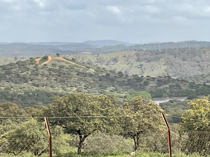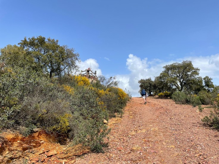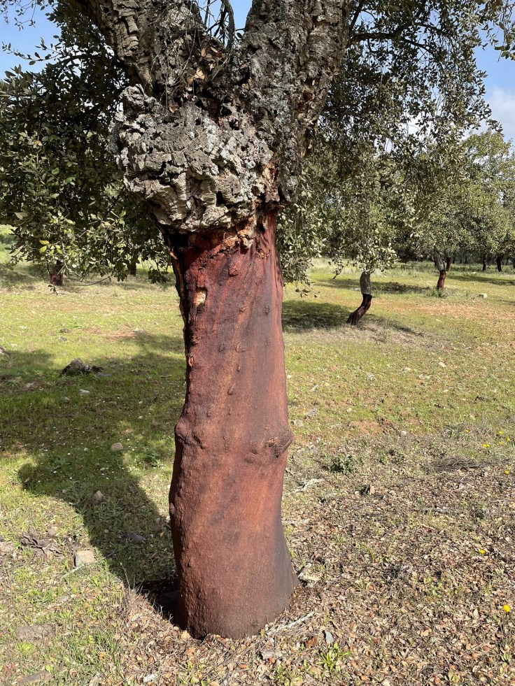 Eindelijk ga ik van het asfalt rechtsaf door een poort en kom in een beschermd natuurgebied. Ik neem hier pauze, lunch, en even later komen Carla en Connor erbij zitten. Met hen loop ik daarna verder over een mooie brede verharde weg met weer die open vegetatie van eiken waar het schors vanaf is gehaald: kurkeiken, denk ik.