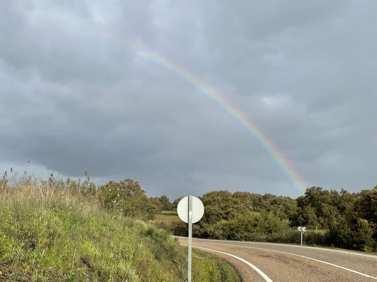 Ik nader regenbuien, terwijl achter me de zon er door breekt. Dus dan zie je een mooie regenboog ontstaan.