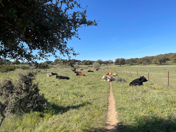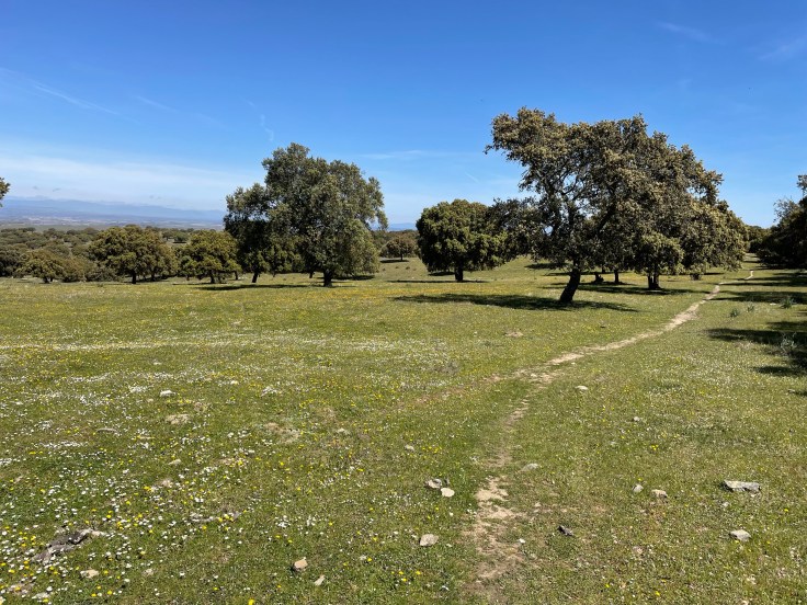 Al gauw kom ik op een smal paadje dat over wel 15 km niet meer verandert; langzaam omhoog en weer omlaag en meestal vlak langs steeneiken, een soort hoge bremstruiken, heel laag gras en kruiden.