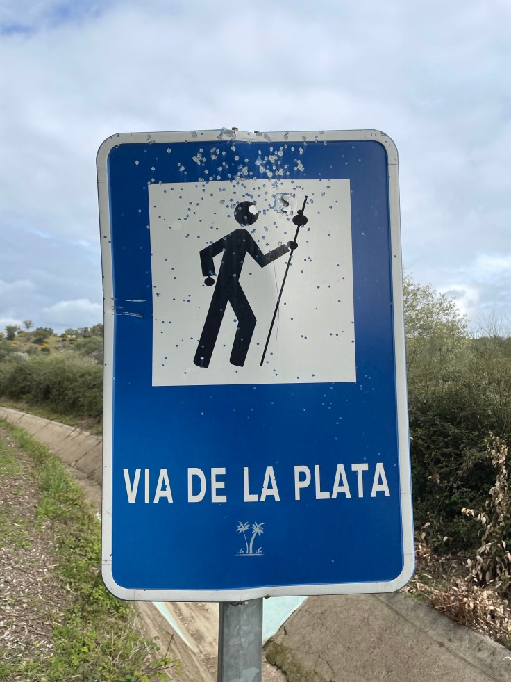 Wanneer ik een asfaltweg bereik, kom ik een met hagel beschoten bord voor de pelgrimwandelaar tegen. Ik ben gewaarschuwd!