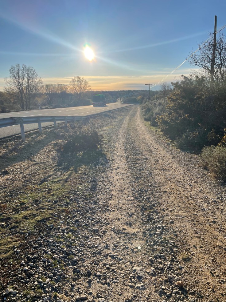 Volgens afspraak doe ik de sleutel in het brievenbusje van het huisje er tegenover. Eerst wat kilometers over asfalt en er langs over een grindpad. De zon begint fel te schijnen.