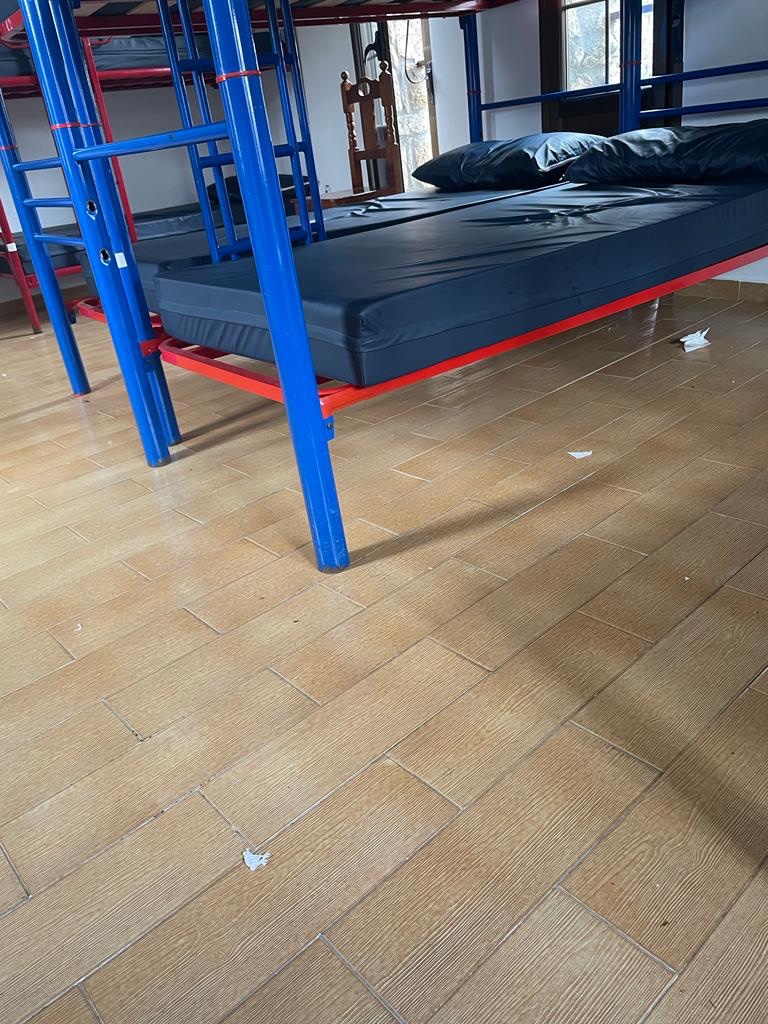 De deur is gewoon open. Ik loop naar binnen en zie op de begane grond vier stapelbedden en een paar rugzakken die helemaal uitgepakt zijn. Verspreid over alle bedden ligt de inhoud. Ik roep: er is niemand. Boven is ook een zaaltje met meer stapelbedden en een douche ruimte. Hier is niet schoongemaakt, ik vertrek meteen en zoek een ander onderkomen in het dorp.