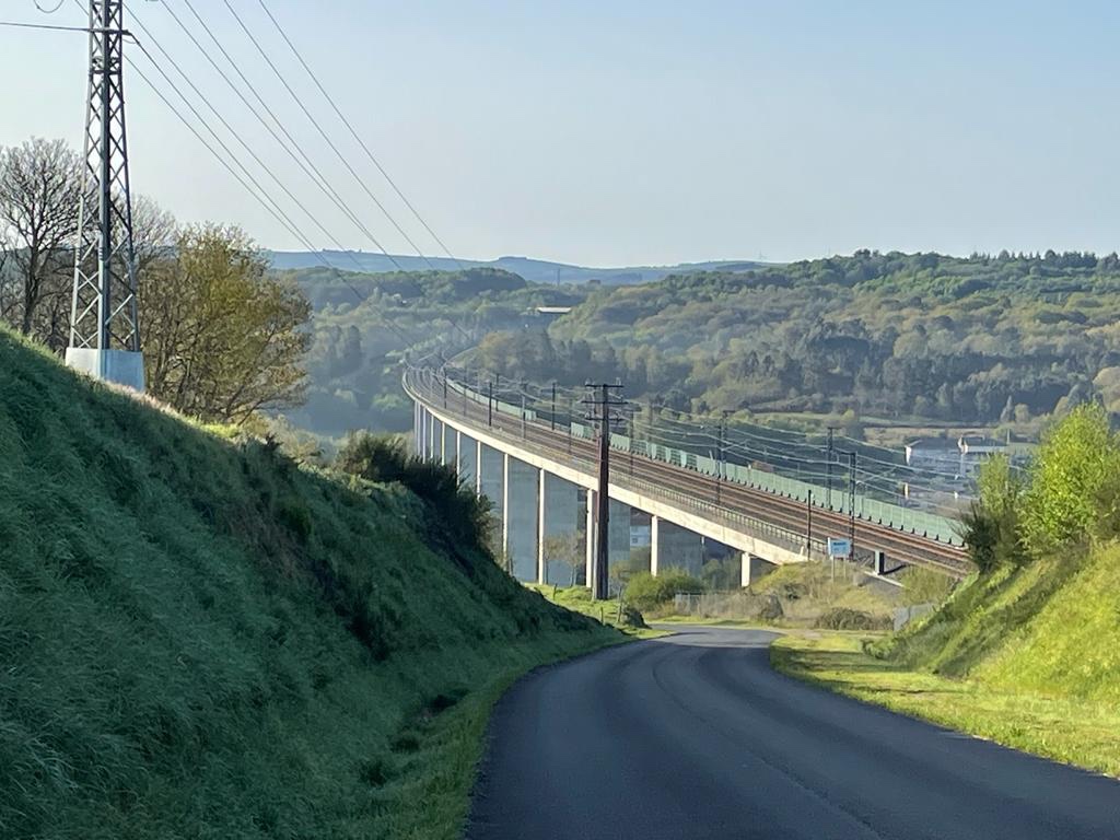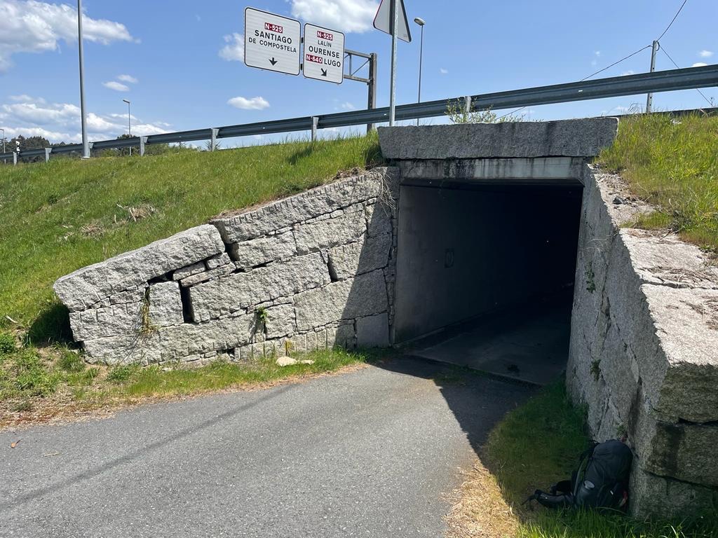 Na een kleine afdaling gaat het behoorlijk steil omhoog en kom ik terecht boven snelwegen en het spoor van de TGV naar Santiago.