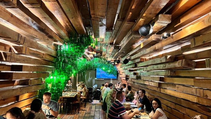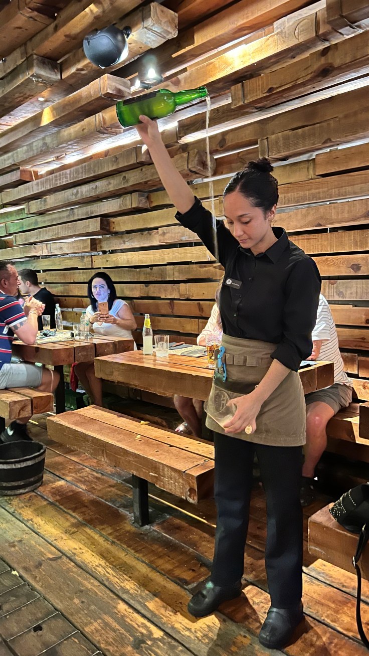 We proberen zo om half negen nog een stempelkaart te krijgen in de kerk maar die is dicht. Maandag om 10 uur kunnen we weer terecht, Dat wordt dan een late start… Maar hier hoger in de bergen is het al minder warm. We komen terecht in een bijzonder restaurant: heel groot en toch een wachtrij. Als bijzondere attractie schenkt het personeel voor iedereen een glas cider in vanuit de fles hoog in de lucht in het glas laag bij de knieën.