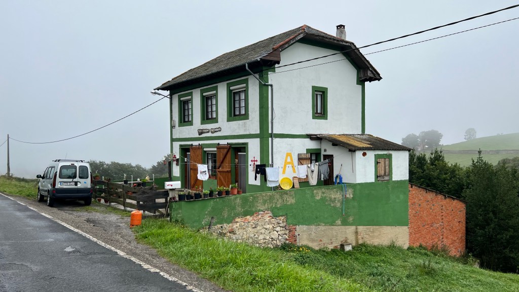 Na deze ochtendbeklimming zien we op afstand een groot wit huis met een enorme A op de zijgevel geschilderd: een herberg, waar we even koffie gaan drinken.