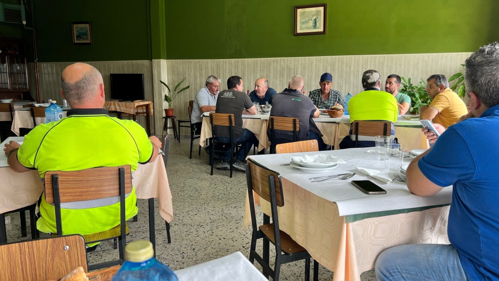 De bewoners blijven toch wat afzijdig in de keuken, dus geen opbeurende gesprekken, helaas. We betalen een donativo = zoveel als we willen en maken het natte mistige deel van de wandeling een paar kilometer later af in een dorp waar we ook lunchen. In een café waar ook lokale bouwvakkers eten in een grote eetzaal. Soep en salade met brood en water. Klaar voor de middagwandeling.