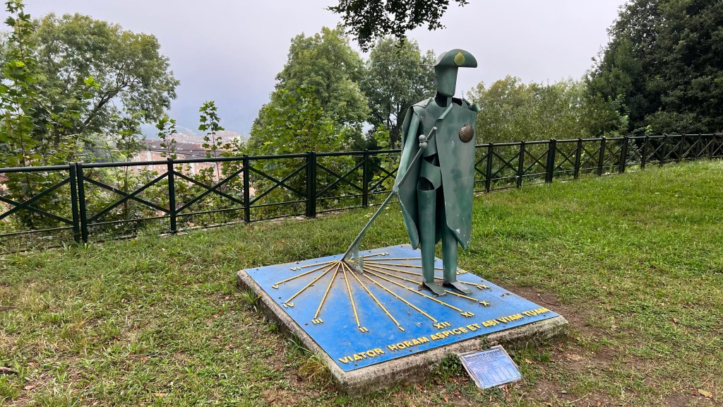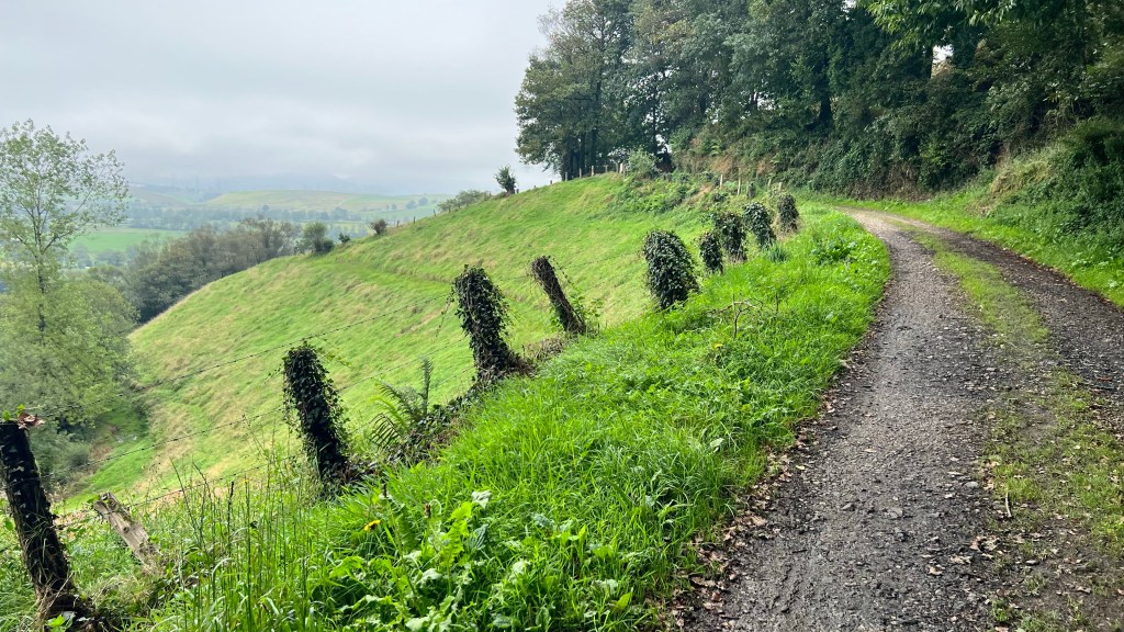 Rechts van ons gaat de helling steil naar beneden, het pad is ongeveer drie meter breed en het vocht hangt als een motregen om ons heen. We komen een paar pelgrims tegen die we gisteren al hadden ontmoet in het restaurant. Verder komen we geen mensen tegen. Halverwege de helling zien we hoog boven ons hoofd het viaduct van de snelweg in aanbouw.