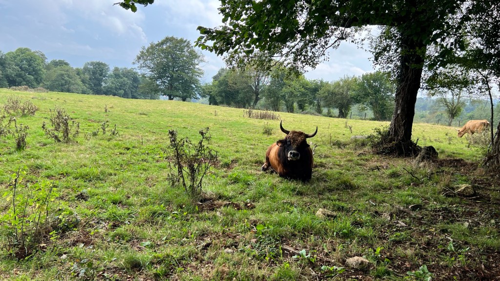 Direct gaan we stijgen en al gauw kijken we neer op het lager gelegen stadje. De helling is lang en flink stijl, om ons heen het volle groen van eikenbomen, kastanjes en eronder kletsnatte varens en braamstruiken.