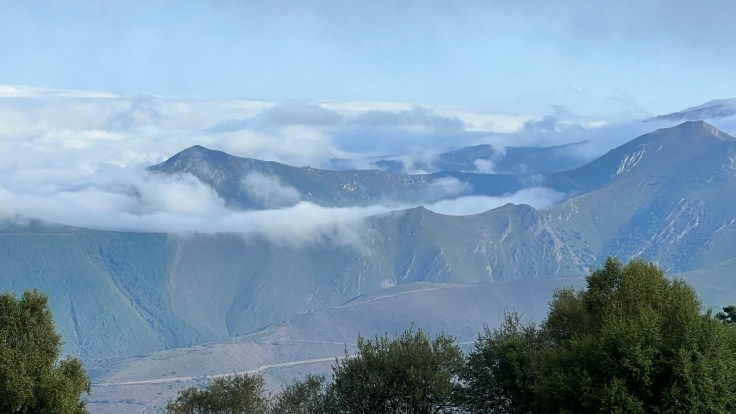 Het is helder en we kunnen in alle richtingen ver kijken, lange kale hellingen met losse stenen en kort gras waar soms jonge bruine koeien grazen. ééntje met zo’n bel om de nek. Aan de bovenkant van de bergtoppen zien we de laatste witte slierten van wolken, die opstijgen vanuit de dalen en uiteindelijk oplossen in de warme blauwe lucht.