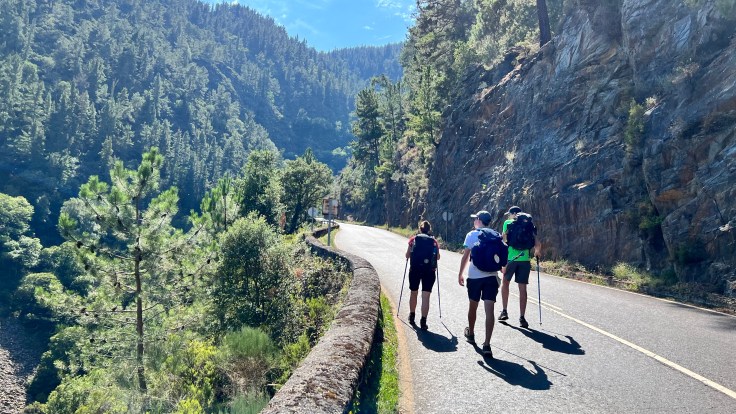 Na de ensalada mixta en veel water voel ik me weer sterk. We lopen in een flink tempo achter elkaar over de asfaltweg en later over een bospaadje naar het dorpje van bestemming.