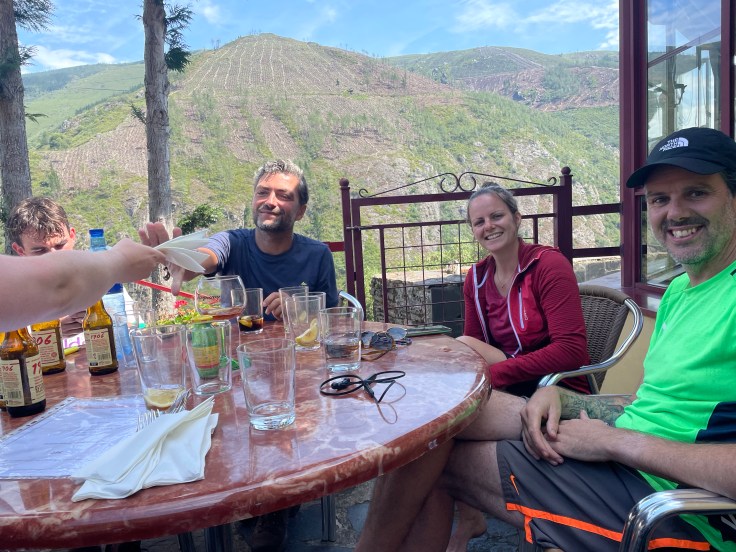 Bij de dam is een groot hotel-café-restaurant waar we met de bekenden en de Engelse Lawrence, die later was vertrokken, op het buitenterras bij elkaar zitten. Ik zie dat iedereen het goed naar de zin heeft. Iedereen is voldaan en er wordt veel gelachen. Leuke mensen die allemaal hun eigen redenen hebben om deze krachttoer te ondernemen. Want het is een pittige reis en vanuit dit terras moet we nog twee uur stijgen naar bijna 400 m hoger.