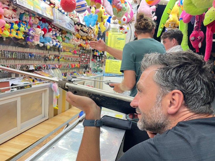 Daarna is het dansen, op een podium een zangeres van het blije populaire genre en achter ons een schiettent waar Erik en ik een kleine knuffelpoppetje winnen. Zo leuk, ik deed maar wat, bijna met m’n ogen dicht.