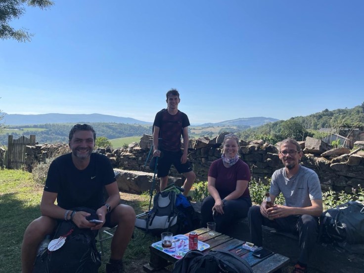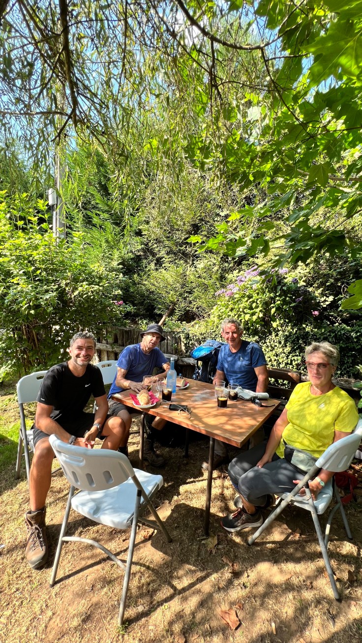 Na een paar uur wandelen komen we eindelijk bij een restaurant dat open is. Hoewel? De keuken is pas ’s avonds open, dus we eten maar een broodje kaas met daarbij een cola met een liter water. Daar zijn ook weer Mathilde en Pierre. Zij heeft vroeger bij een reisbureau gewerkt en hij bij Orange en nu sinds kort met pensioen. In Frankrijk is dat in tegenstelling tot bij ons 62 jaar.