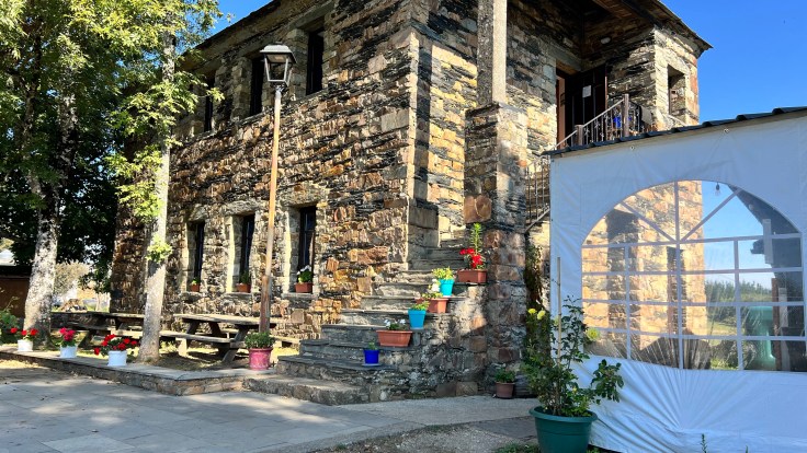 Na zo’n 6 kilometer ontmoeten we in Castro drie bekende pelgrims bij een van de mooiste stops: op een prachtige lokatie een nieuw gebouw met winkeltje, bar en terras.