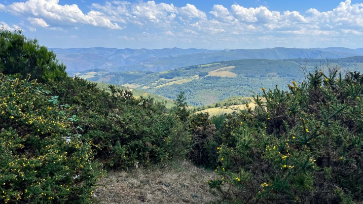Af en toe stilstaan, niet alleen om te rusten, maar ook om te genieten van die vergezichten. Op het hoogste punt staan geen bijzondere borden of symbolen, maar na het afdalen zien we de eerste kilometerpalen van de provincie Galicië.