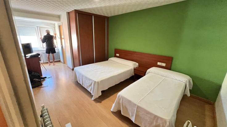 We komen voor een dichte deur met een cijfercode, Erik belt naar de beheerder en dan blijkt dat er daar lichte paniek is. We moeten onze ID gegevens kopiëren en mailen. Na veel gedoe heen en weer over de telefoon zijn we uiteindelijk via deurcodes na bijna een uur op een slaapkamer in het gebouw. Dan zien we dat er alleen een tweepersoons bed staat. Weer bellen, ook dat wordt hersteld, we krijgen een andere kamer met twee bedden.
