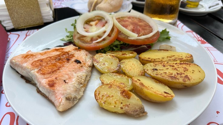 Nu zo snel mogelijk het oude centrum in om wat te eten. Dat lukt goed: pelgrimsmenu waar we kunnen kiezen voor een flink stuk zalm. Met bier.