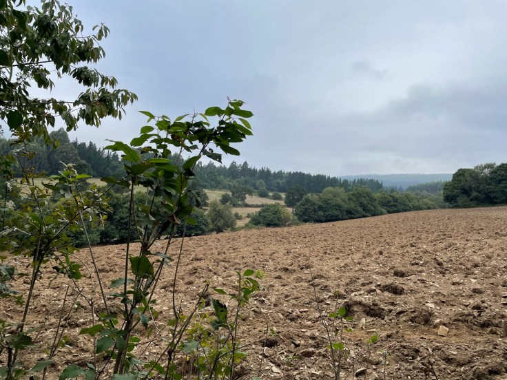 We kunnen niet meer genieten van het verre uitzicht door de wolkennevels; dichterbij is het landschap open met wat bosjes.