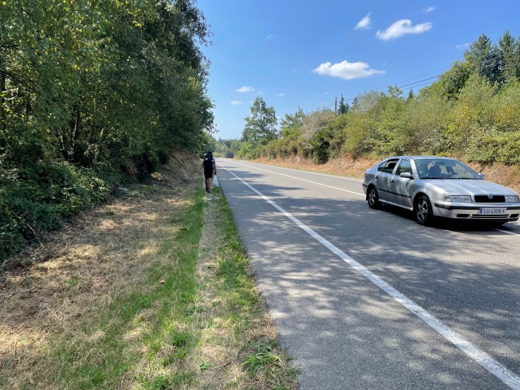 Het zwaarste stuk loopt langs een autoweg op het asfalt in de zon waar we hard doormarcheren tot we na enkele kilometers weer het bos induiken.