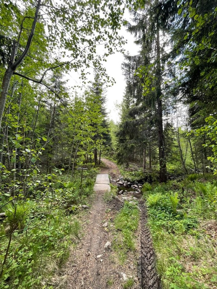 Het is een zacht glooiend landschap van weidegronden, extensieve veeteelt met koeien in de wei, bosranden van vooral berken en langs de berm fluitenkruid en paarse bloemetjes. Onder aan de hellingen zie je steeds weer van die prachtige grote houten huizen met veranda of balkon met houten hekwerk: een soort paradijs.
