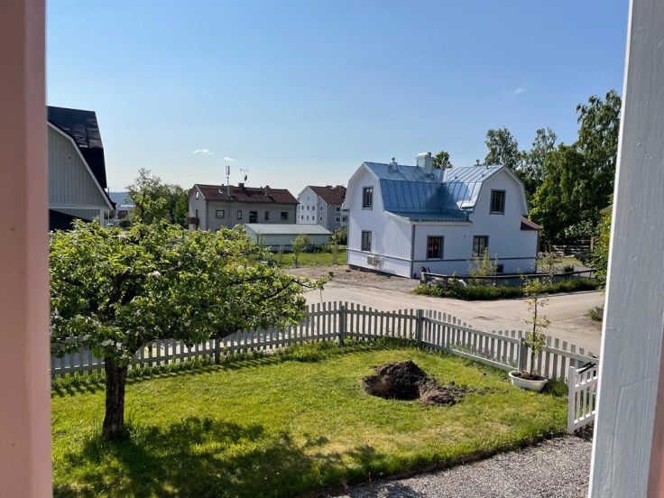 Midden in de nacht – het schemerde want het zijn lange dagen hier – hoorde ik de regen zachtjes op het raam tikken. Volgens de voorspelling is dat de laatste neerslag die ik mag verwachten: het wordt een paar weken mooi droog weer met 20-25 graden. Ik voel me helemaal thuis hier in dit Zweedse huis: al dat hout heeft iets warms.
