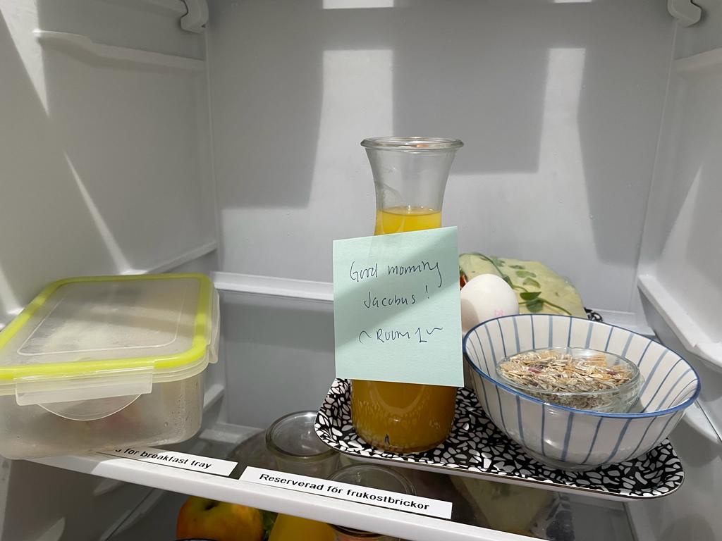 De B&B-mevrouw heeft het ontbijt in de koelkast gezet met een “goeiemorgen Jacobus”-briefje erbij.