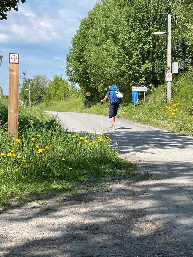 Dan zie ik de eerste voetpelgrim voorbij lopen. De Zweedse Walter – grote rugzak met tent en kookgerei – die een dag na mij gestart is in Sundsvall. Hij is timmerman, net een maand met pensioen, woont in Stockholm en heeft ooit een paar jaar in Östersund gewoond. Hij hoopt daar nog oude vrienden te ontmoeten. Ik krijg een energie-reep en samen lopen we verder.