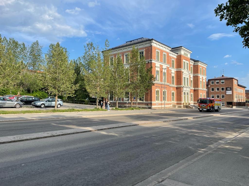 Östersund is een grote stad. Schoon, grote bakstenen gebouwen, brede asfaltwegen met heel weinig autoverkeer. Op de foto rijdt toevallig een brandweerauto voorbij.