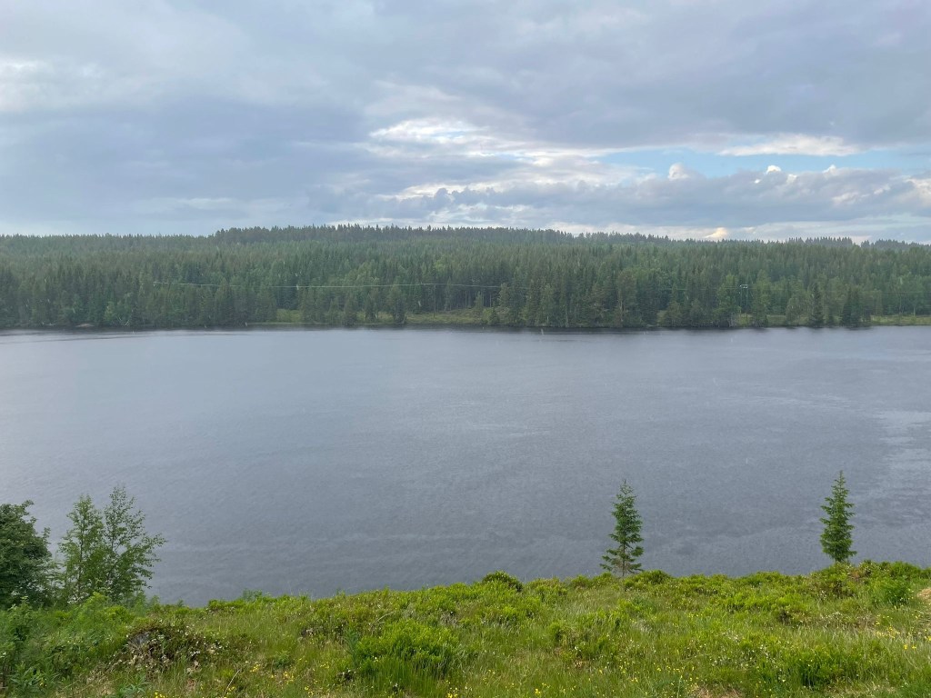 Het is weer mooi weer, maar de zon schijnt niet zo fel als gisteren, het is minder helder. Om weer terug op het St. Olavspad te geraken moet ik weer terug naar de brug, dan een grote draai maken tot langs de oever van een ander meer. Dan wandel ik weer in de goede noordoostelijke richting. Het landschap is open met weilanden, gemaaid gras en kleine berkenbosjes.